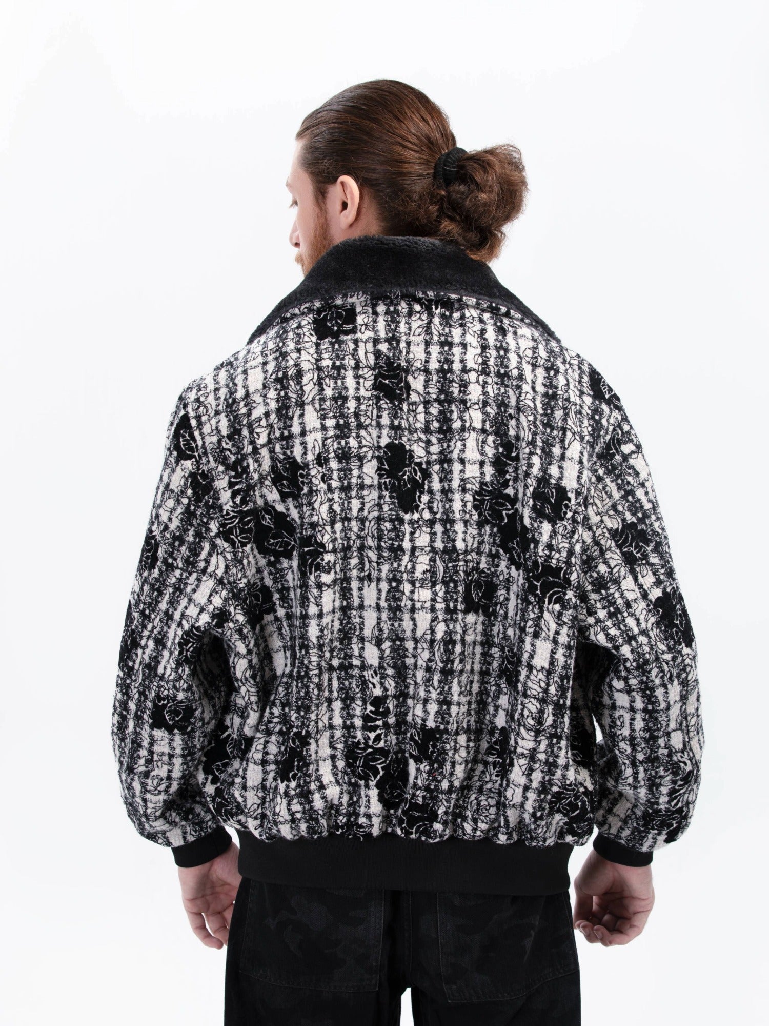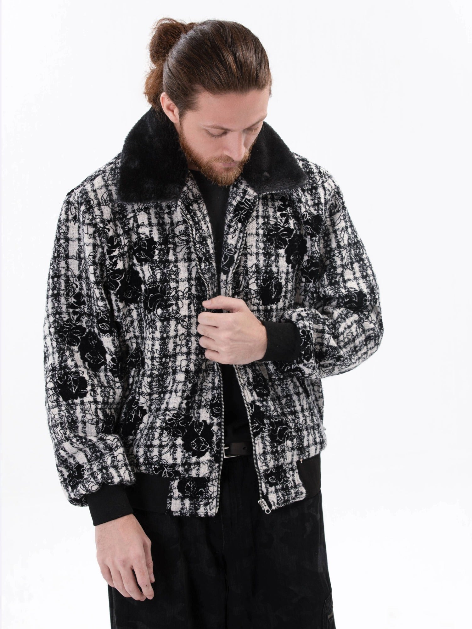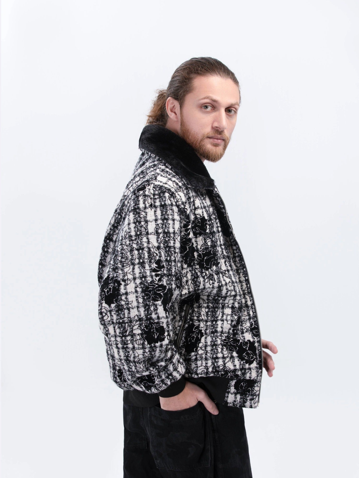 جاكيت جاكار إيطالي فاخر بنقشة زهور سوداء متقنة وياقة فرو فاخرة. مصمم لإطلالة شتوية جريئة، بملمس غني وتفاصيل راقية. مزيج مثالي من الأناقة والفخامة، وأسلوب عصري مستوحى من أزياء الشارع.