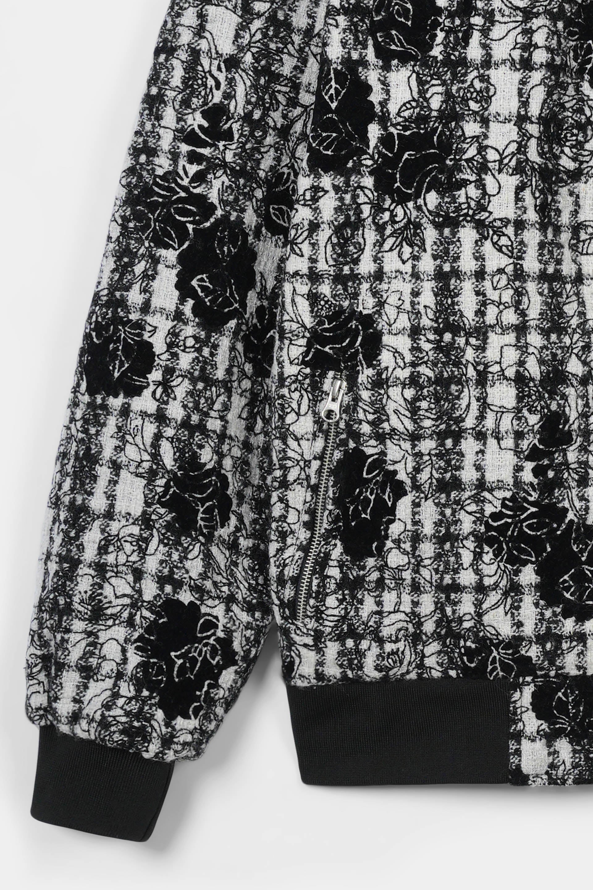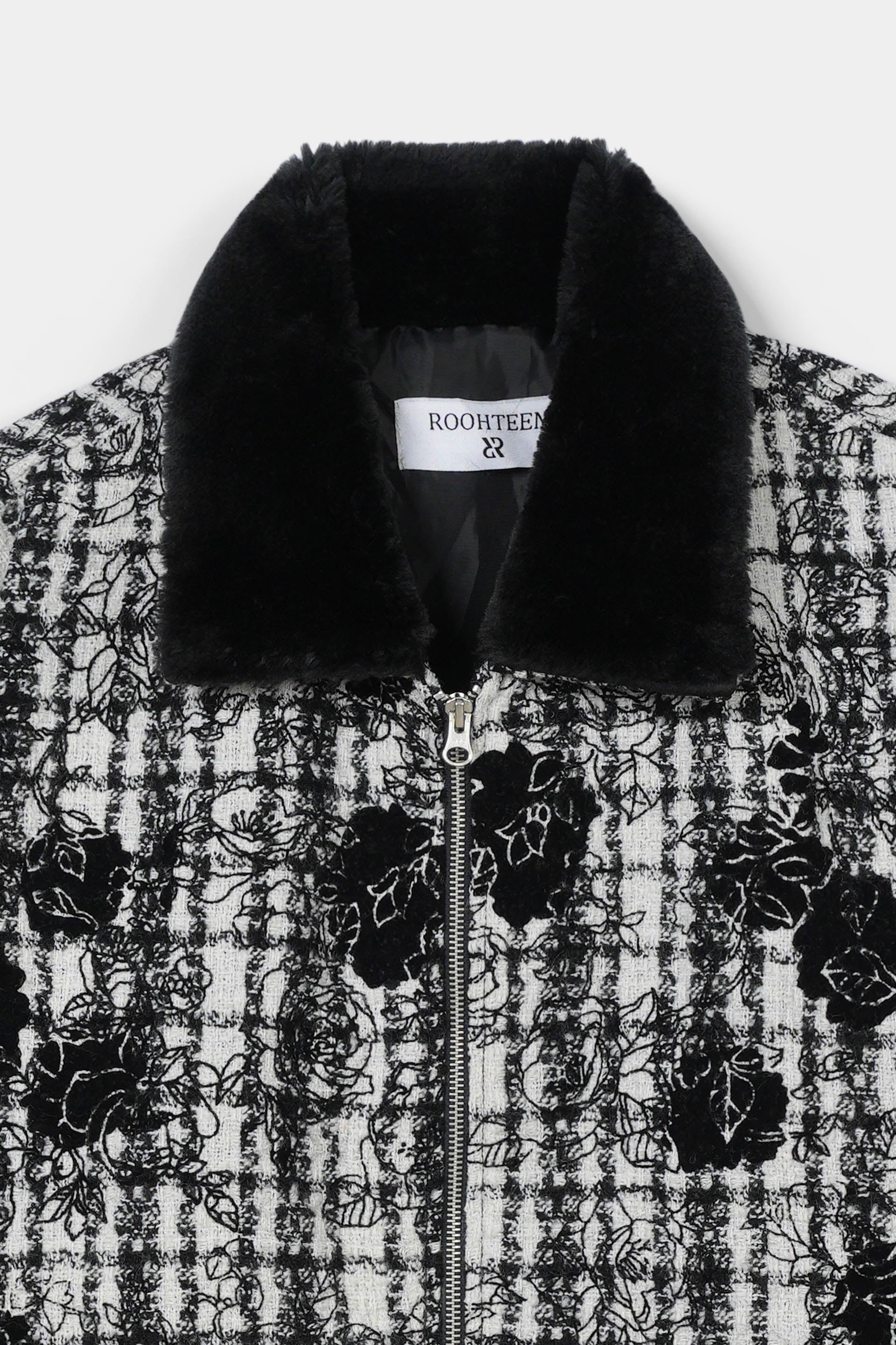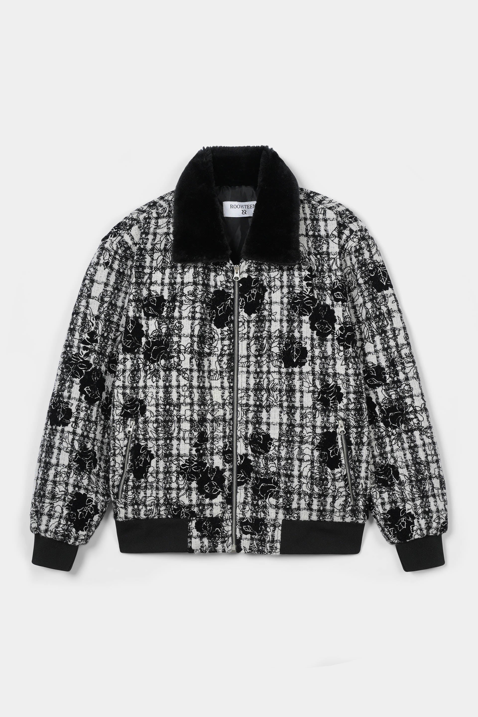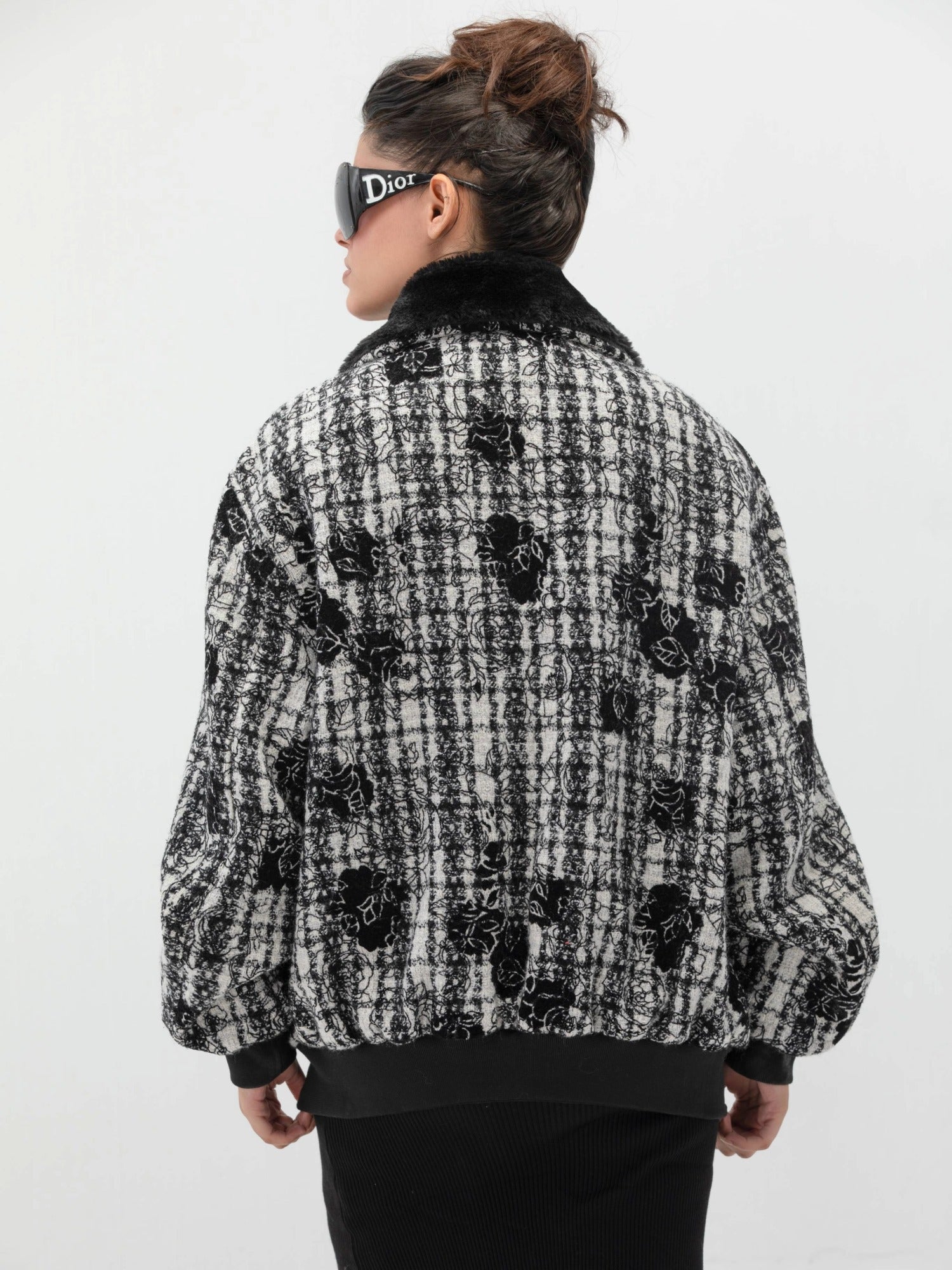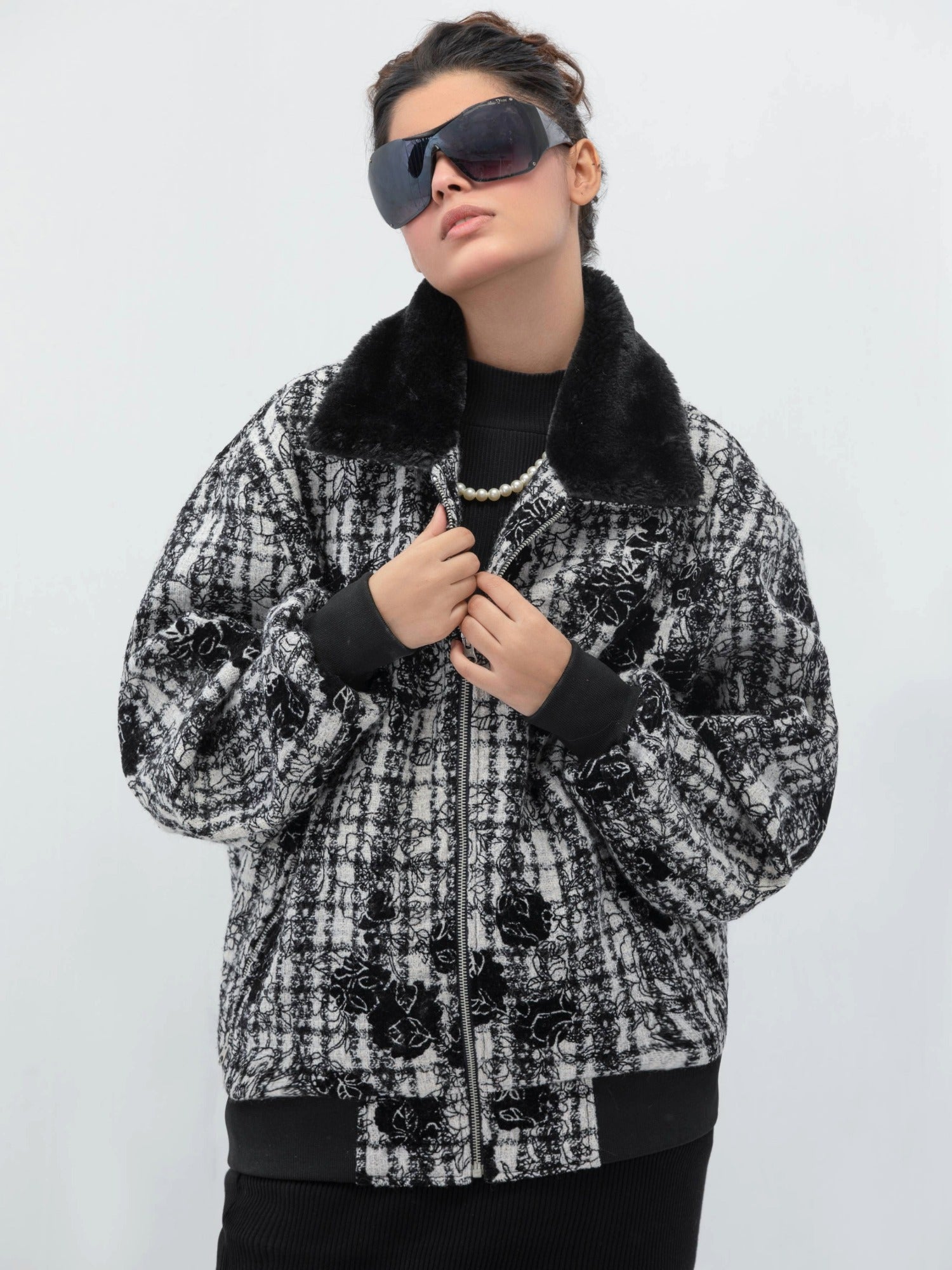 جاكيت جاكار إيطالي فاخر بنقشة زهور سوداء متقنة وياقة فرو فاخرة. مصمم لإطلالة شتوية جريئة، بملمس غني وتفاصيل راقية. مزيج مثالي من الأناقة والفخامة، وأسلوب عصري مستوحى من أزياء الشارع.