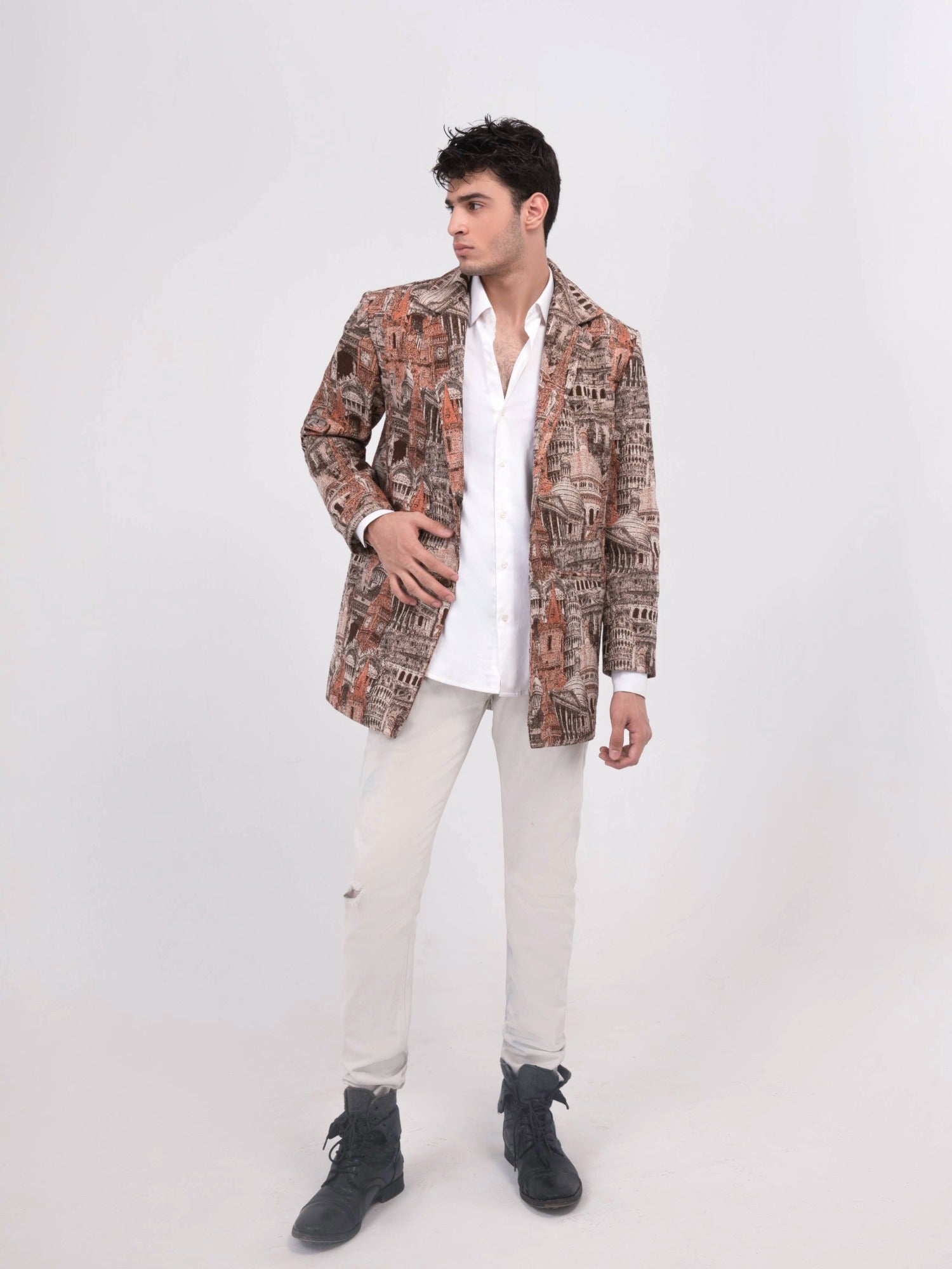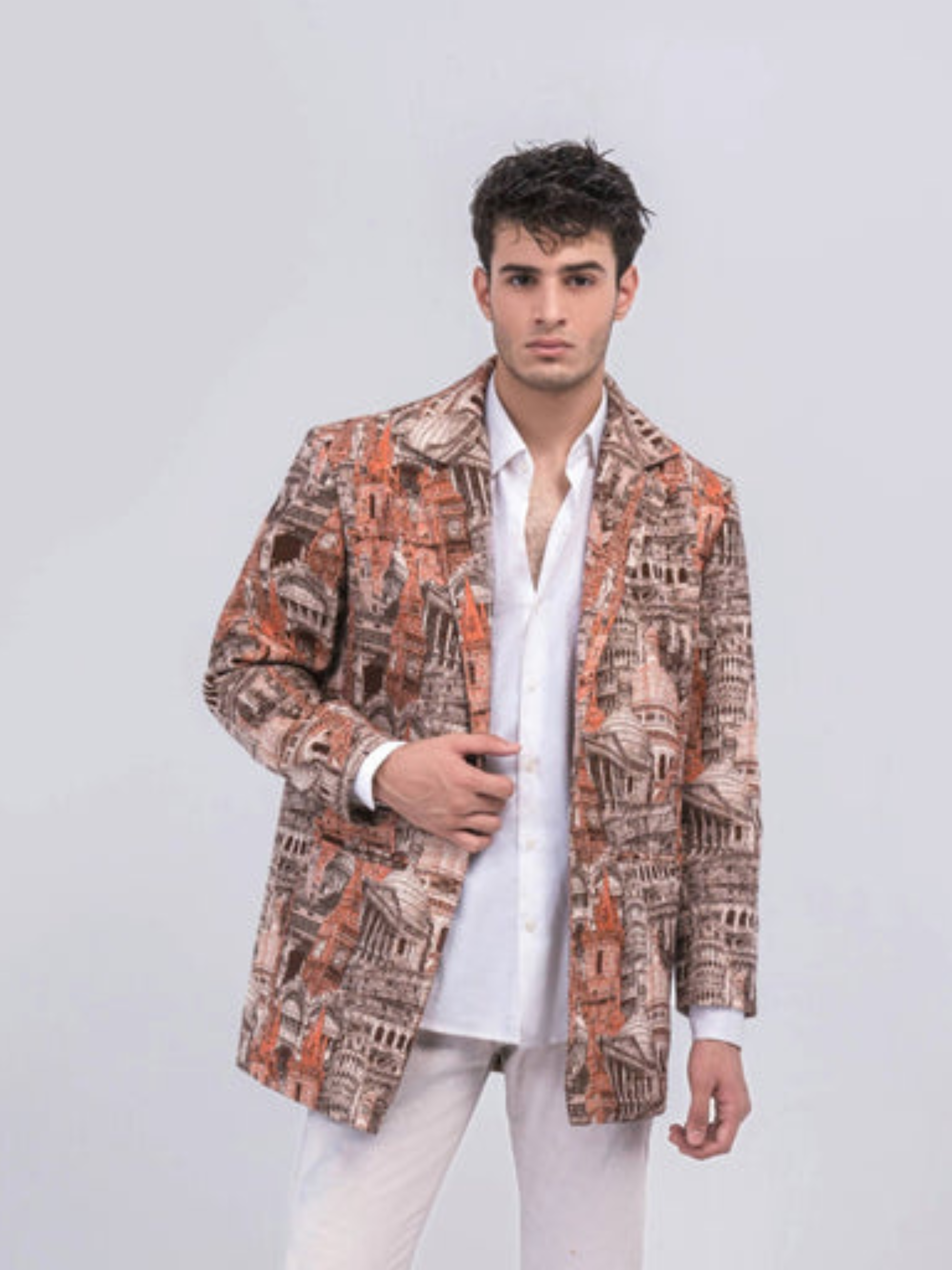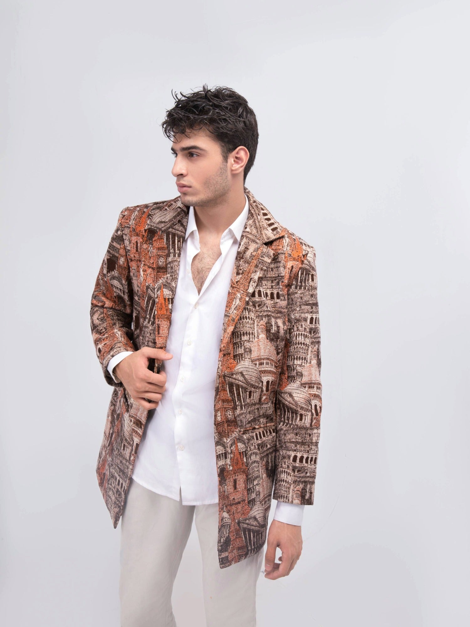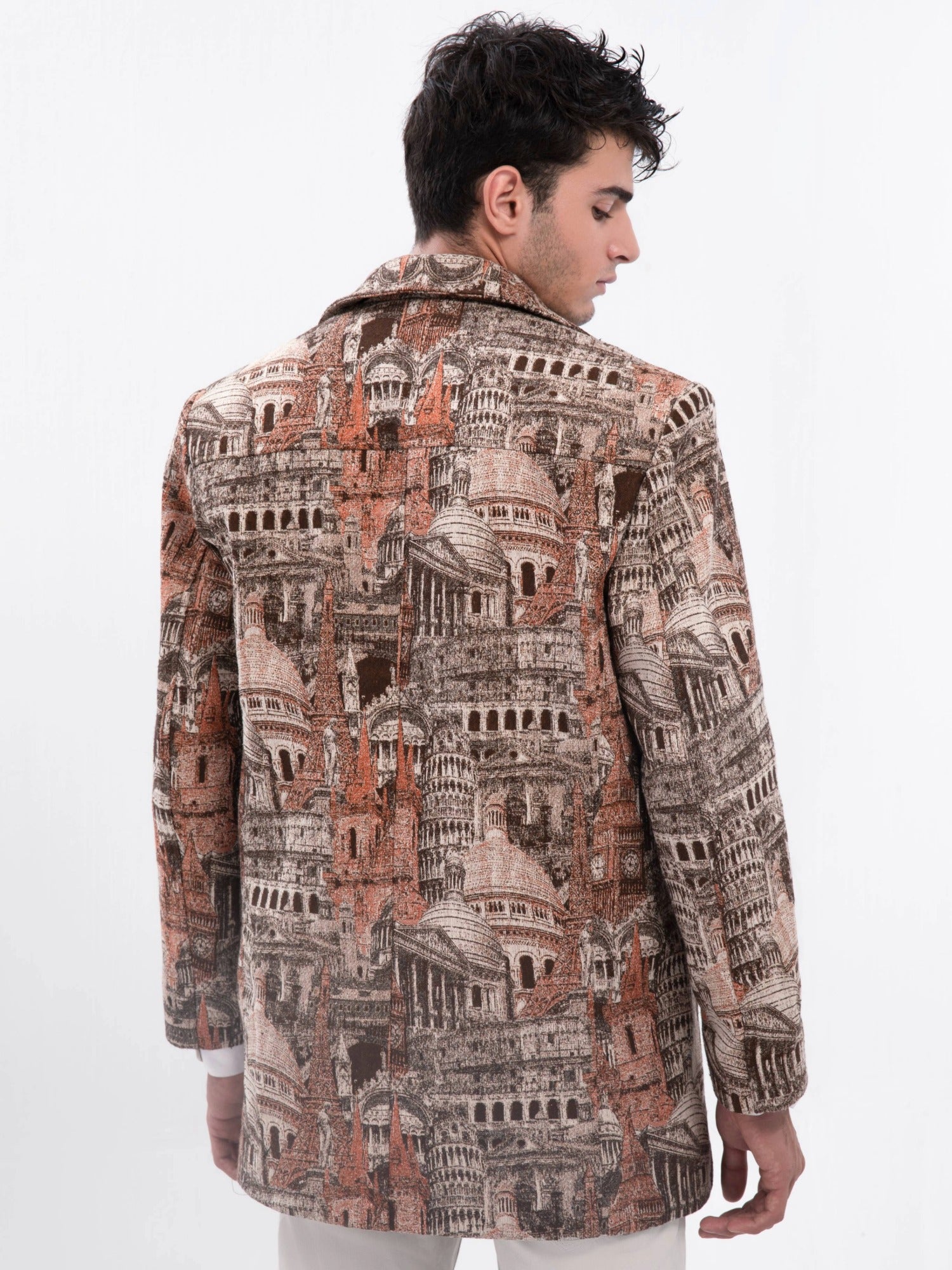 معطف جاكار إيطالي فاخر مستوحى من العمارة الأوروبية التاريخية. نسجه على طراز النسيج الجداري يُضفي مشهدًا بصريًا غنيًا بالقباب والأبراج والأقواس. مصمم لمن يُقدّرون الحرفية الفنية مع الرقي الخالد.