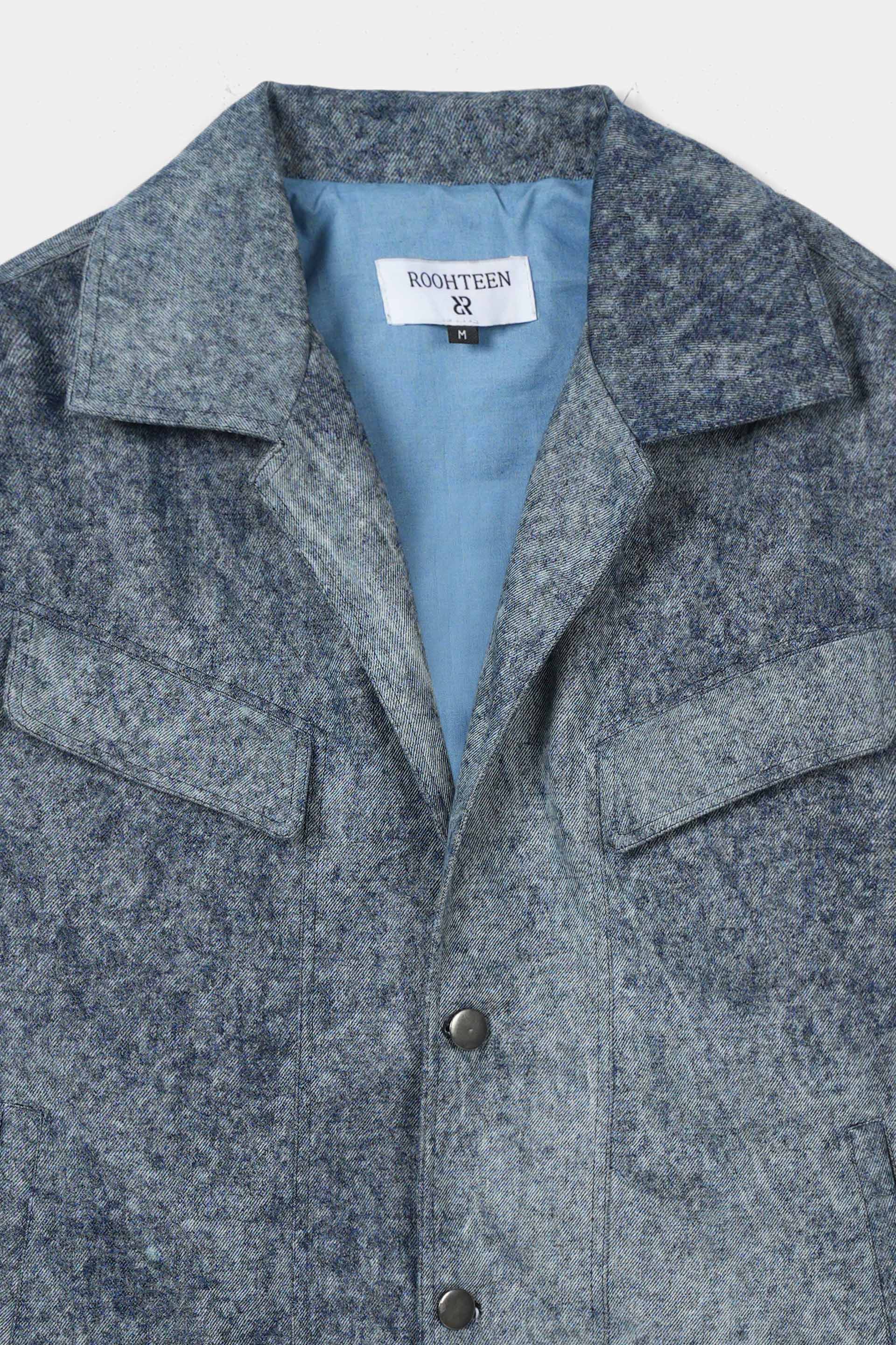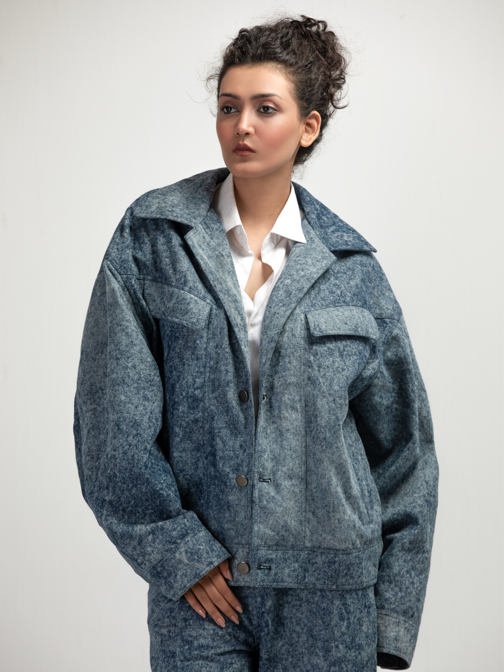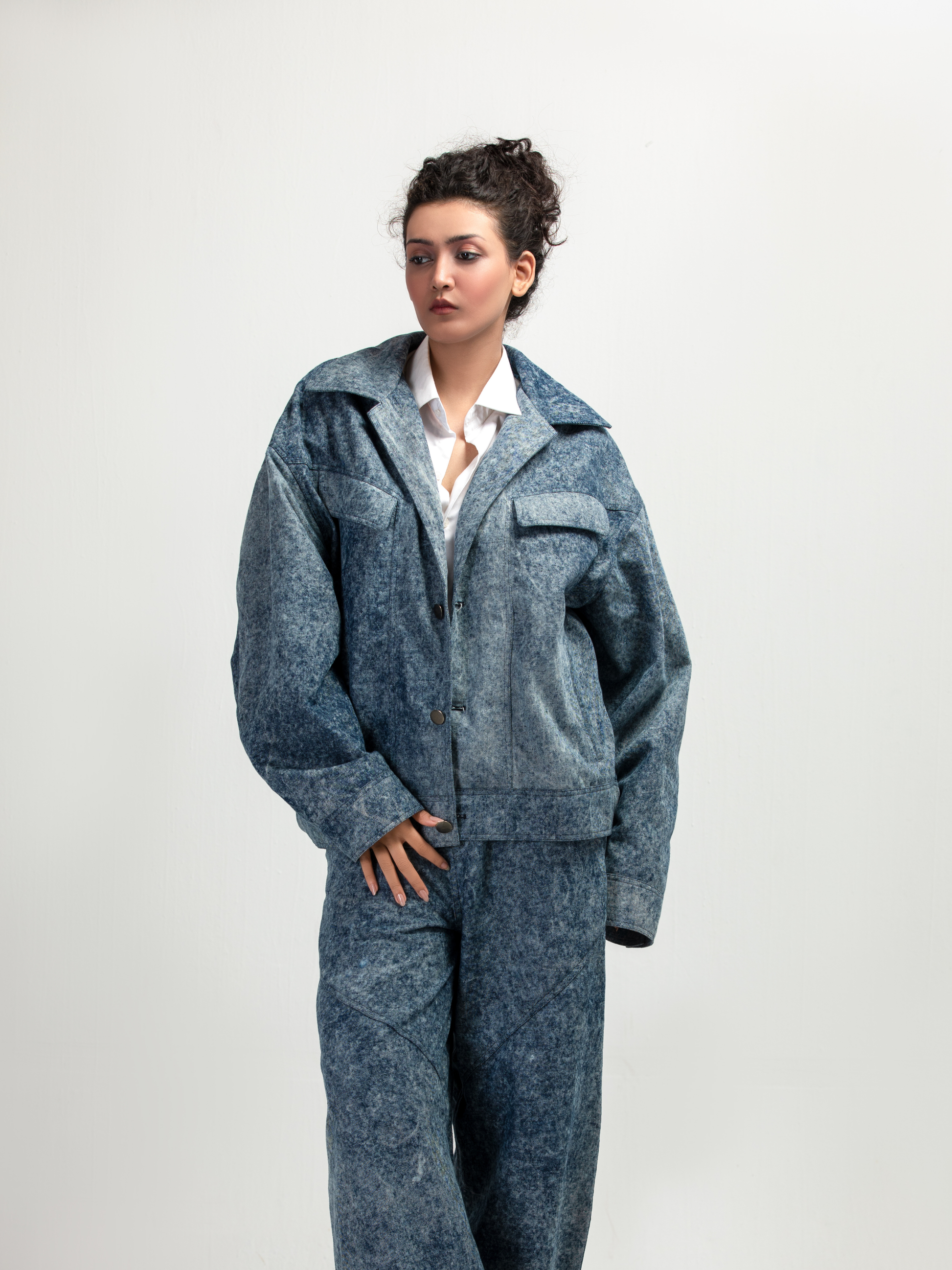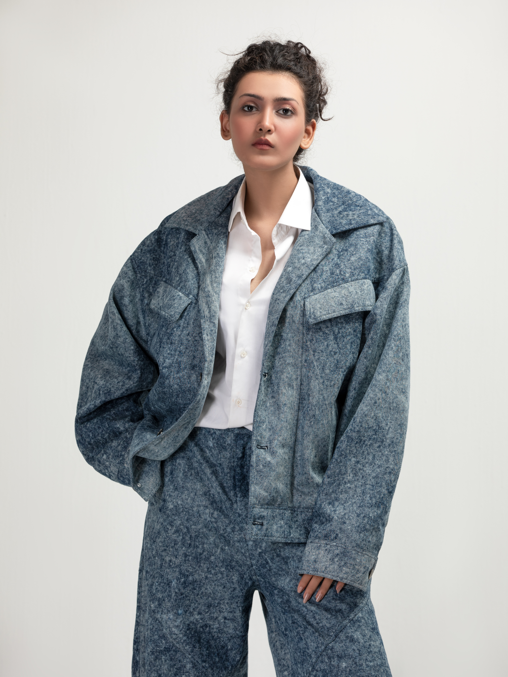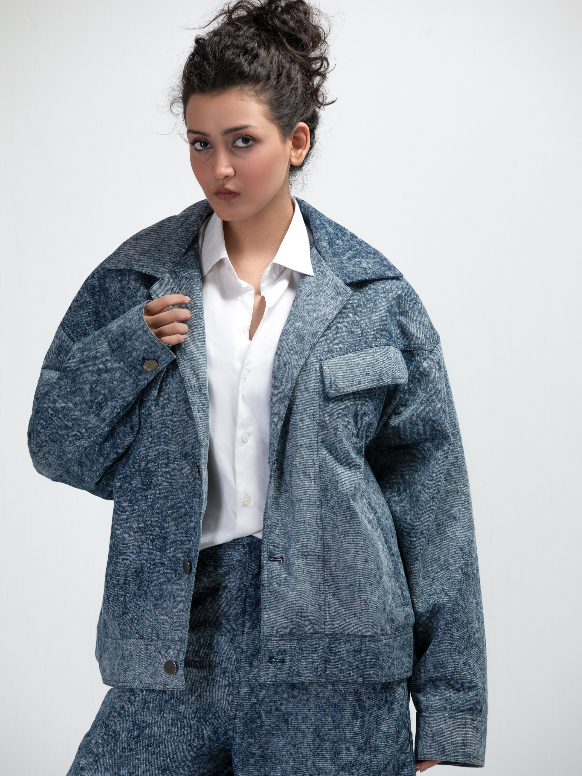 جاكيت جينز مريح مصنوع من قماش مغسول بالأحماض، مصمم لإطلالة كلاسيكية أنيقة. مصمم بأكتاف عريضة وجيوب بغطاء وإغلاق أمامي أنيق لإطلالة عصرية بسيطة. مزين بعلامة روهتين الجلدية المميزة في الخلف لإضفاء لمسة راقية.