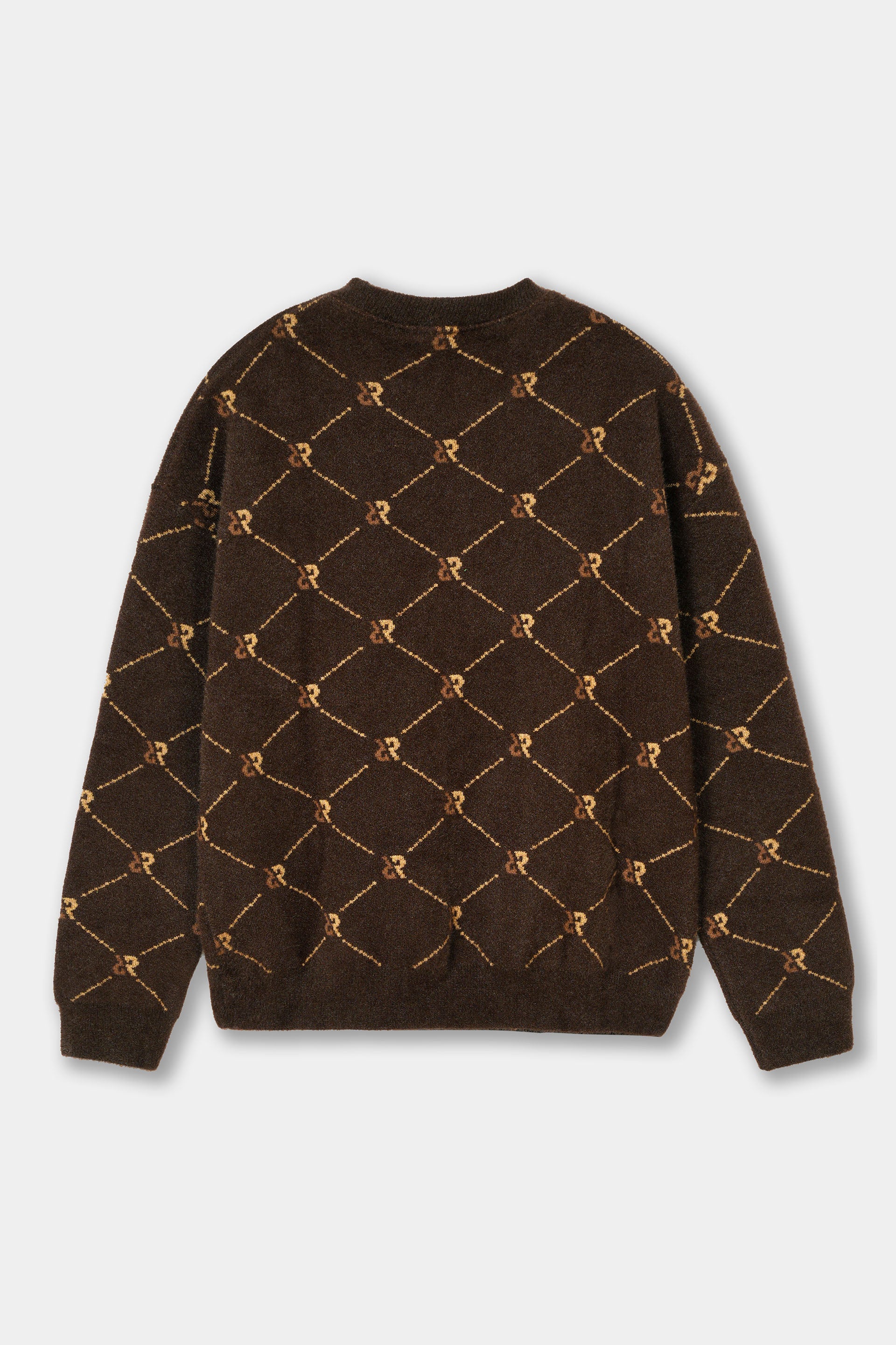سترة جاكار R-Weave تجمع بين النمط التراثي والبساطة العصرية. مصنوعة بدرجات بنية غنية، يتداخل تصميمها الشبكي بالكامل مع شعار "R" على نسيج جاكار ناعم. قطعة أساسية راقية تجمع بين الدفء والراحة والهوية المميزة.